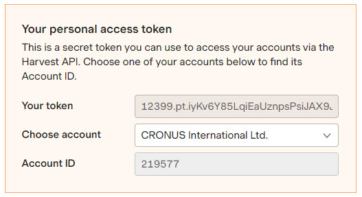 Business Central communicates with Harvest by using an account id and an access token. The access token is configured on the Harvest website where you also can find your account ID.
